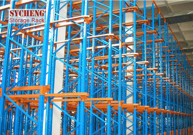 駛入式貨架是把數排傳統式貨架連接起來,沒有專用的走道,其配置方式可以為兩組駛入式貨架背對背安裝或單一組靠墻,叉車的進出皆使用相同的走道。存放時先由內部存放,再依序向外存放,而出貨時先由外部貨物取出,再向內依次取貨,儲存密度非常好, 但不能先進先出。適合周期性批量作業及存取物料頻率高的原料倉庫或轉運倉庫產品。