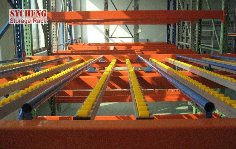 •     將貨物置于滾輪上,利用一邊通道存貨,另一邊通道取貨。貨物在重力作用下向下滑動。單元貨架每層載重量通常在1000kg以內,高度在2.5米以內。 廣泛應用于制造業、商業、配送中心、裝配車間以及出貨頻率較高的倉庫。