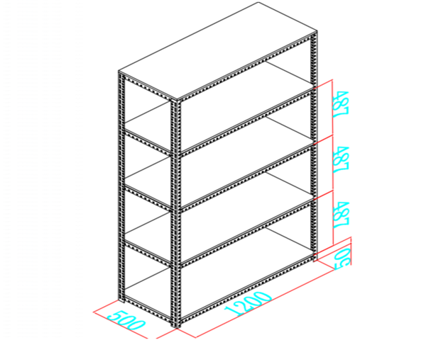 上圖是另外一個倉儲貨架的設(shè)計圖,圖中標(biāo)注了貨架長度1200mm,由圖中紅色劃線可以看出,該長度包含了兩邊立柱的規(guī)格,所以該長度是指倉儲貨架的外尺寸、外空、外徑。一般標(biāo)注該倉儲貨架的尺寸規(guī)格時可以這樣寫:1200(外)*500*2000mm,或者1200*500*2000mm。標(biāo)注外尺寸時可以注明是外尺寸也可以不標(biāo)注,不標(biāo)注時默認(rèn)為外尺寸,但倉儲貨架的長度是內(nèi)尺寸時是必須標(biāo)注的。